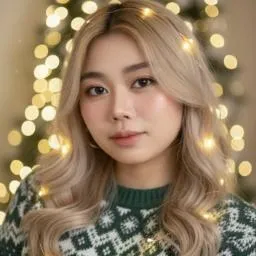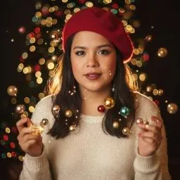 Glowing lights portrait Create a close-up 8K portrait of me surrounded by floating glowing holiday lights, like magical orbs in the air. I wear a red beret, a glittery cream sweater, and subtle festive makeup. My hands are raised as if interacting with the lights, and my hair glows softly under the warm illumination. The background is dark but filled with sparkling bokeh lights, giving a surreal, dreamy, and festive atmosphere. Keep my facial features consistent with the uploaded photo.