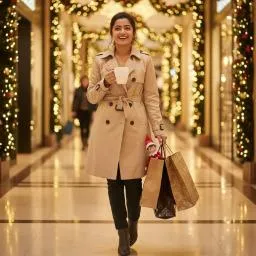 Stylish holiday photo of [insert avatar description] her hair framing her face, walking through an upscale shopping center adorned with garlands, wreaths, and golden Christmas lights. She’s wearing a beige trench coat, tailored trousers, and heeled boots. The Elf on the Shelf peeks playfully from one of her designer shopping bags. (Golden tones, elegant city reflections, luxury holiday energy, confidence meets warmth.)