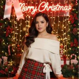 Create ultra-high-resolution 8K photo-realistic images of the original person (100% exact facial likeness eyes nose lip, no alterations).A pretty slender woman 31 year old posing indoors in front of a beautifully decorated Christmas setup, surrounded by glowing fairy lights, ornaments, candy canes, and festive decorations. Behind her, a bright neon sign reading 'Merry Christmas' glows warmly, complemented by a large, shiny white ribbon bow and golden lights that fill the space with a cheerful