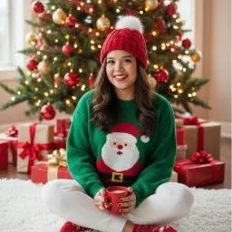 Ultra-realistic photo of [insert avatar description], sitting on the living room floor surrounded by wrapping paper and opened gifts. She’s wearing cozy plaid pajama pants and a white knit sweater, laughing while holding a mug of cocoa. The Elf on the Shelf peeks out mischievously from behind a half-opened gift box. (Soft golden morning light, cozy holiday glow, Christmas tree lights twinkling in the background, joyful energy.)