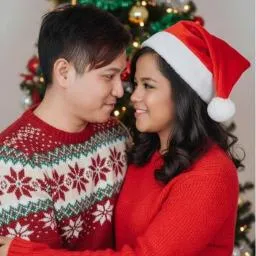A close-up portrait of a couple celebrating Christmas day together, smiling warmly as they hold each other close. Soft Christmas lighting behind them. The girl is wearing red sweater and a santa hat,while the man wears a festive knit sweater and gazes at her lovingly. Their faces are close together, lit the glow of holiday lights and a decorative Christmas tree in the background. Ultra-realistic details.