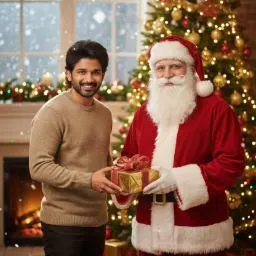 Take the uploaded photo of the male subject and transform it into a warm, realistic Christmas photo with Santa Claus. Keep the subject’s facial features natural and identical to the photo. Santa stands beside him in a classic red velvet suit with white fur trim and a golden belt buckle, smiling warmly. The scene is set in a cozy indoor Christmas setup — glowing fireplace, decorated Christmas tree with golden ornaments, and soft falling snow visible outside a frosted window. Both are posing cheerfully, exchanging a wrapped gift with red and gold ribbon. Lighting is golden and soft, with cinematic bokeh and gentle rim light from the Christmas tree. Realistic 8K photo, festive tones (red, gold, green), warm and joyful atmosphere, no cartoon or filter effect. With 'Merry Christmas to you and family' text at top